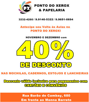 O desconto de 40% abrange as mochilas, cadernos, estojos e lancheiras, e inclusive vale nos pagamentos com cartões e convênios. O Ponto do Xerox & Papelaria fica na Rua Barão do Cambaí, 680, em frente ao Instituto Menna Barreto. Confira as ofertas clicando no álbum em nosso Facebook: