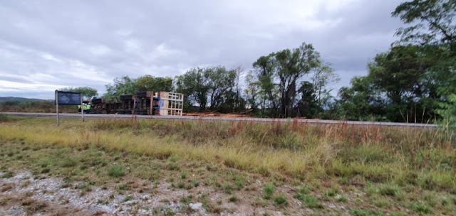 | Caminhão que carregava toras de madeira tombou na BR-290 entre Santa Margarida e Vila Nova do Sul, na manhã desta sexta-feira (fotos Vinícius Duarte/Portal Farrapo) |