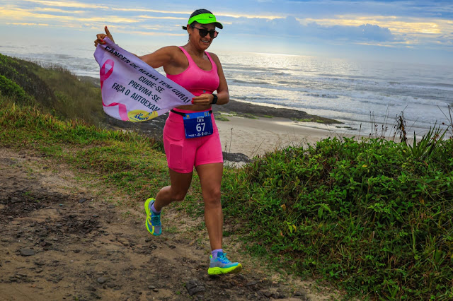 | Após cirurgia do câncer de mama, Cátia disputou uma das maiores provas de maratona do litoral gaúcho, a Travessia Torres-Tramandai |